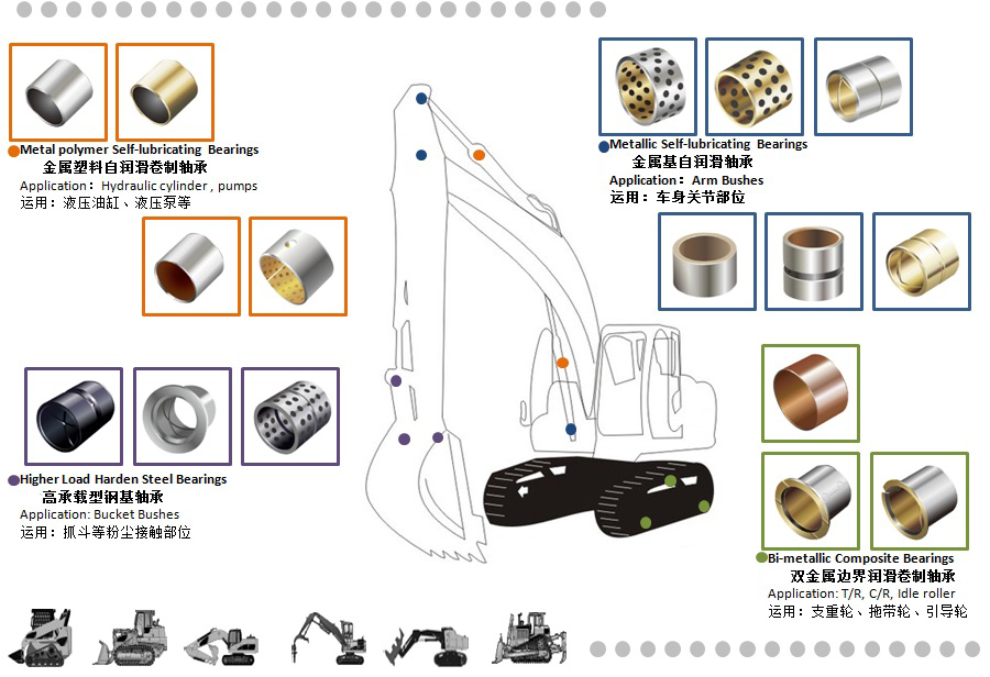 經(jīng)過十多年的努力,公司與各主機(jī)廠商配合開發(fā)了適合底盤行走機(jī)構(gòu)、車身件、液壓元件等在內(nèi)的多種自潤滑軸承材料,包括雙金屬邊界潤滑卷制軸承、金屬基自潤滑 軸承和金屬塑料自潤滑卷制軸承等。這些軸承材料具有在高承載條件下優(yōu)秀的耐磨性能和抗粉塵性能,同時(shí)自潤滑技術(shù)使得軸承的維護(hù)周期大大延長,提高了設(shè)備的 利用率,降低了維護(hù)成本。